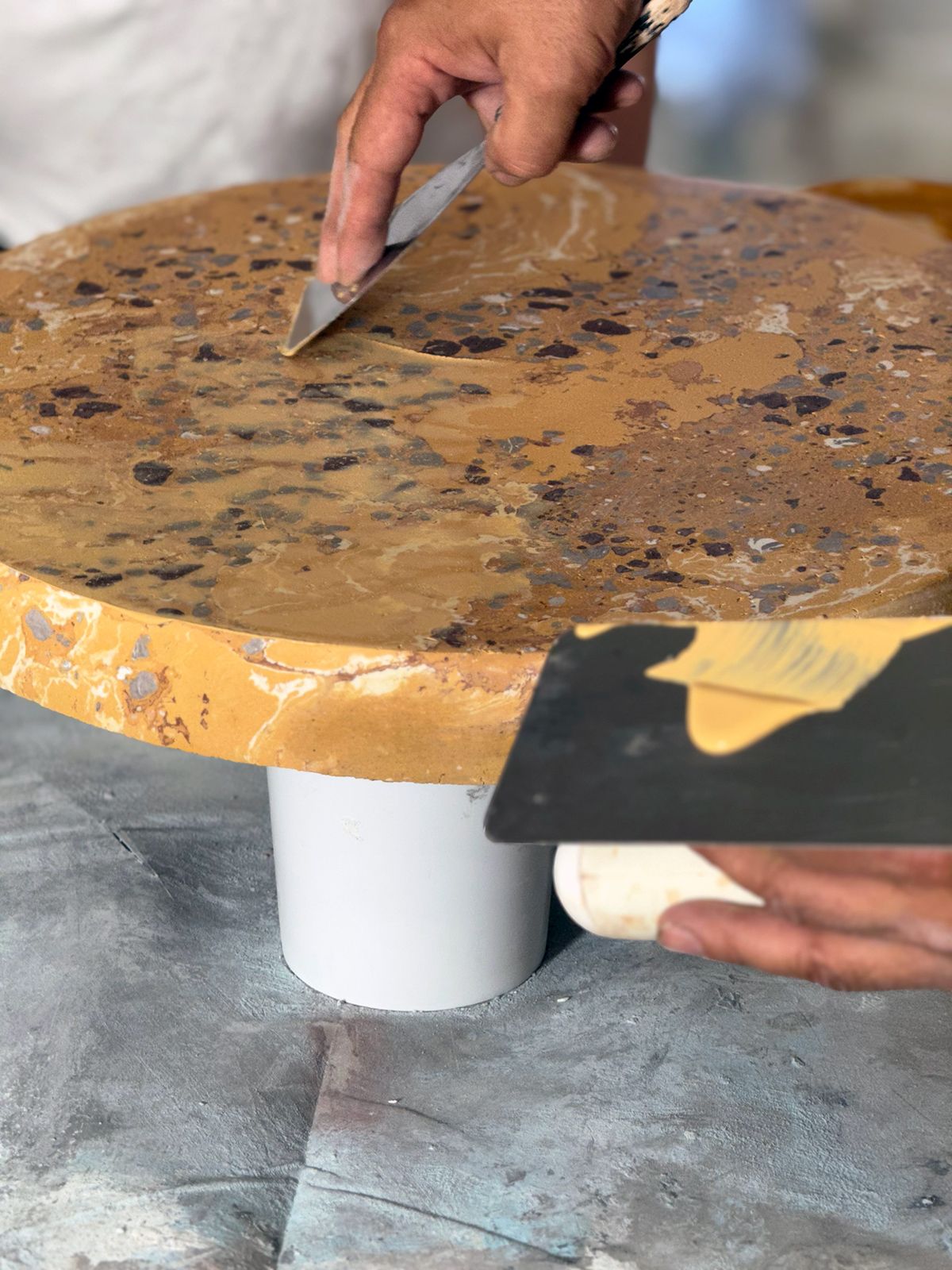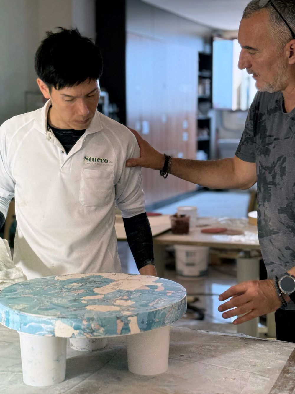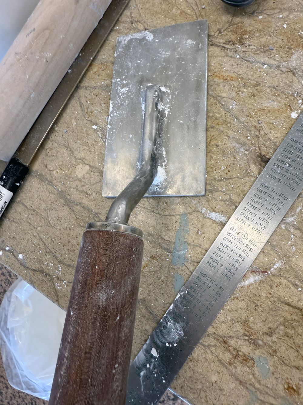 What was particularly impressive was the trowel used to finish the clay-like material smoothly. Mr. Zeljko said he had this trowel custom-made by a blacksmith, a very heavy one, structured to transmit force firmly without losing to the material. Its high finishing precision was exactly proof that tools and technology became one.